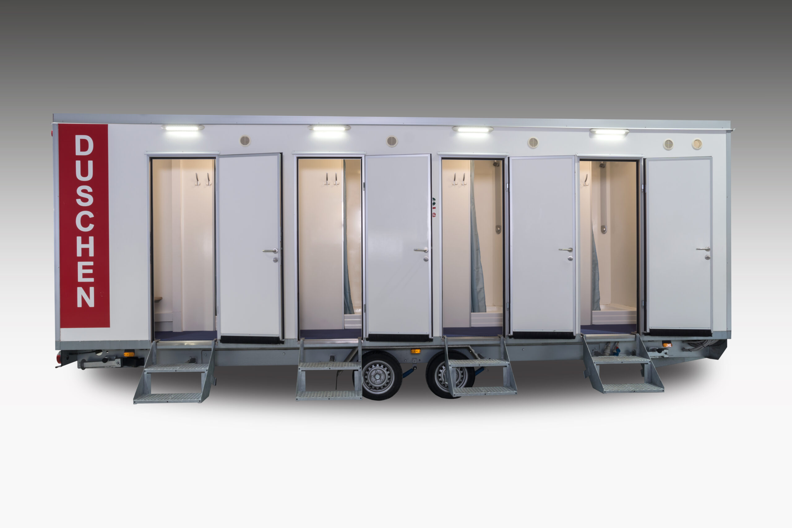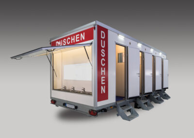 Das geringe Gewicht und die Pkw-Anhängerkupplung Ermöglicht einen Kostengünstigen Transport. Der Duschwagen verfügt über ein Damen- und Herrenabteil mit je 4 Duschkabinen und einem separaten Waschbereich mit Spiegel.