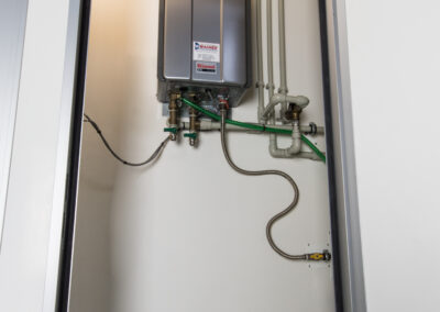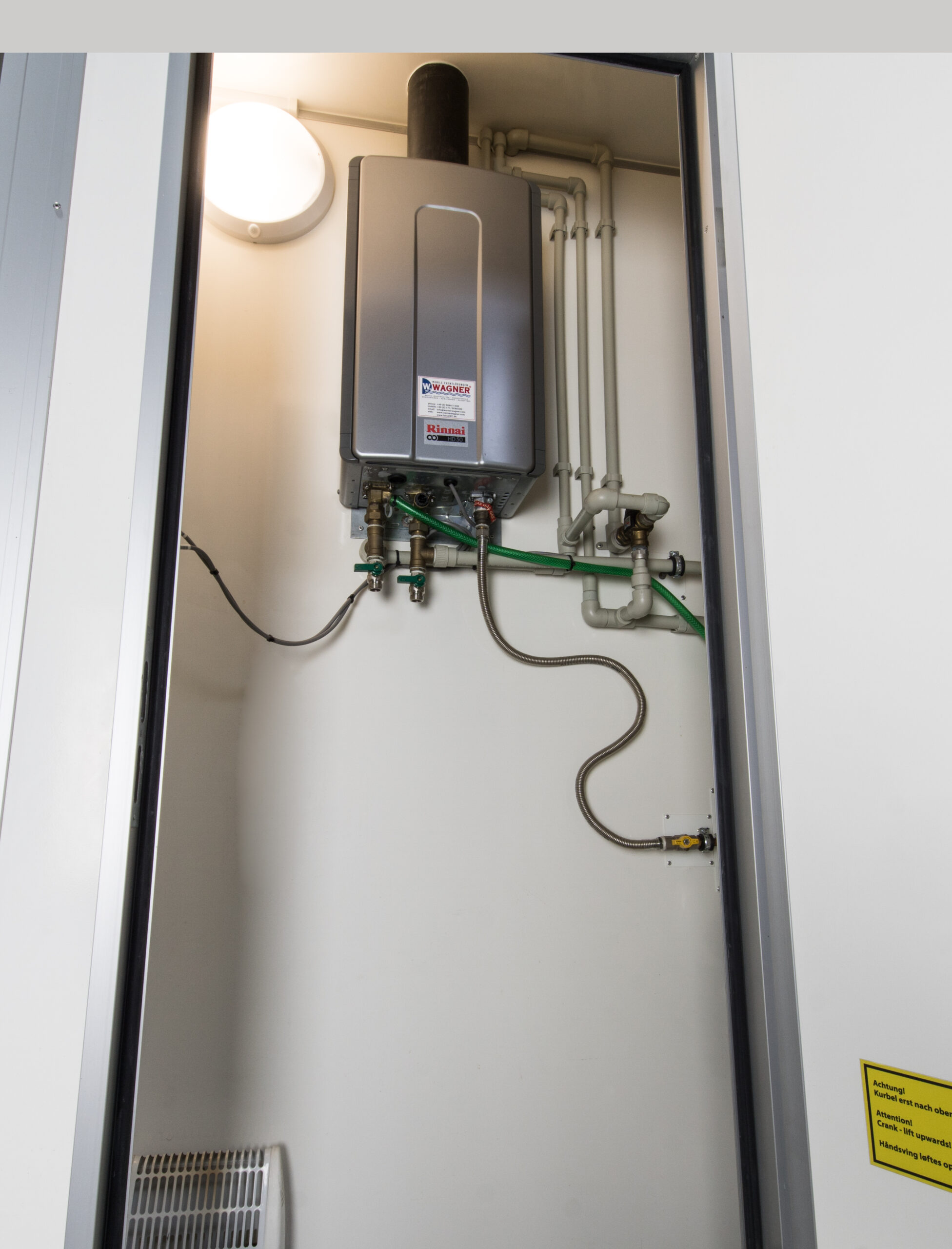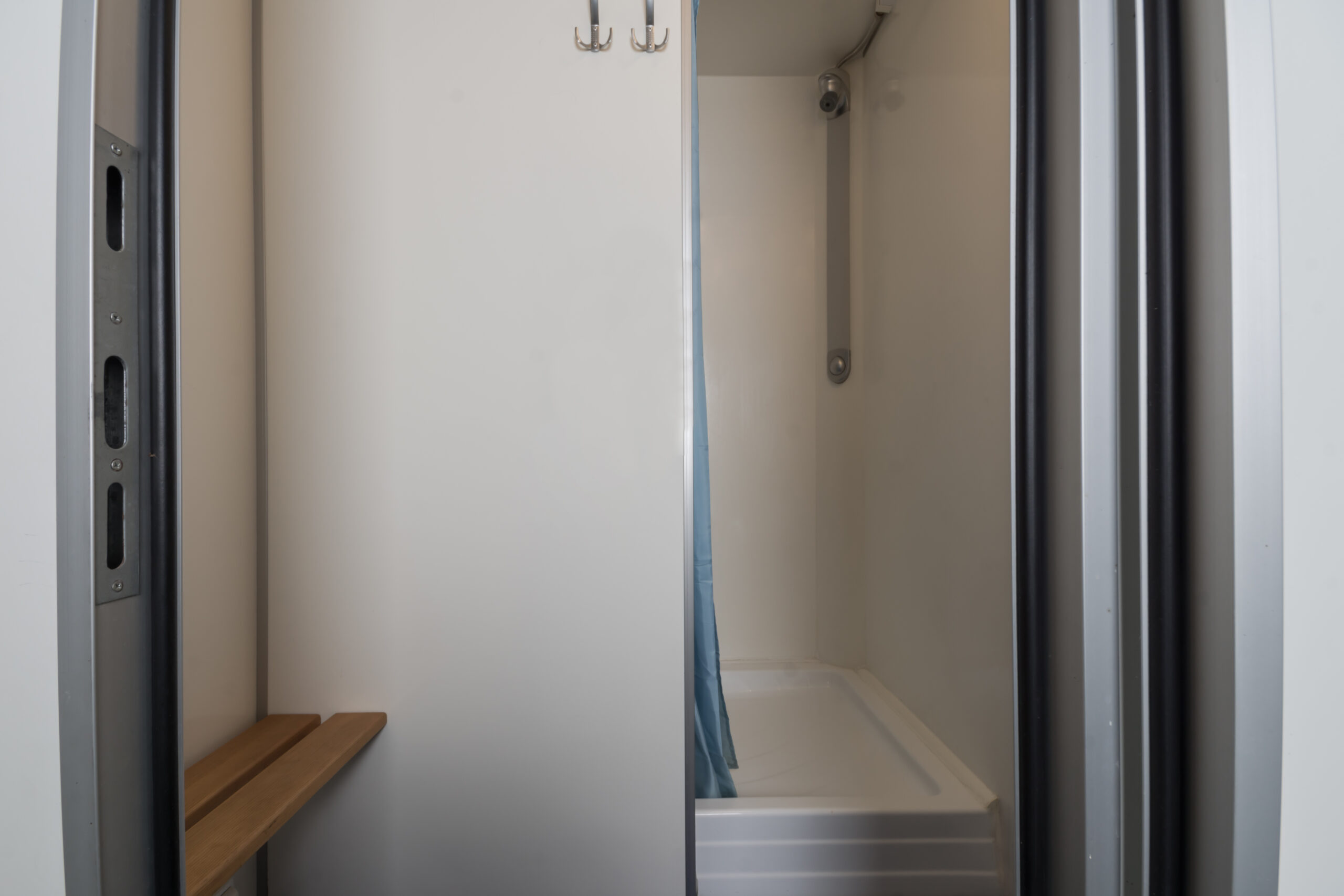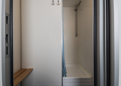 Wertigkeit Hygiene und Sauberkeit verliehen. Die moderne Bauweise bietet glatte, optisch ansprechende und leicht zu reinigende Oberflächen. Der komplette Innenraum des Duschwagens besteht aus wasserunempfindlichen Materialien, das heißt die Reinigung kann problemlos mit Wasser aus einem Schlauch oder gegeben falls mit einem Hochdruckreiniger bearbeitet werden.